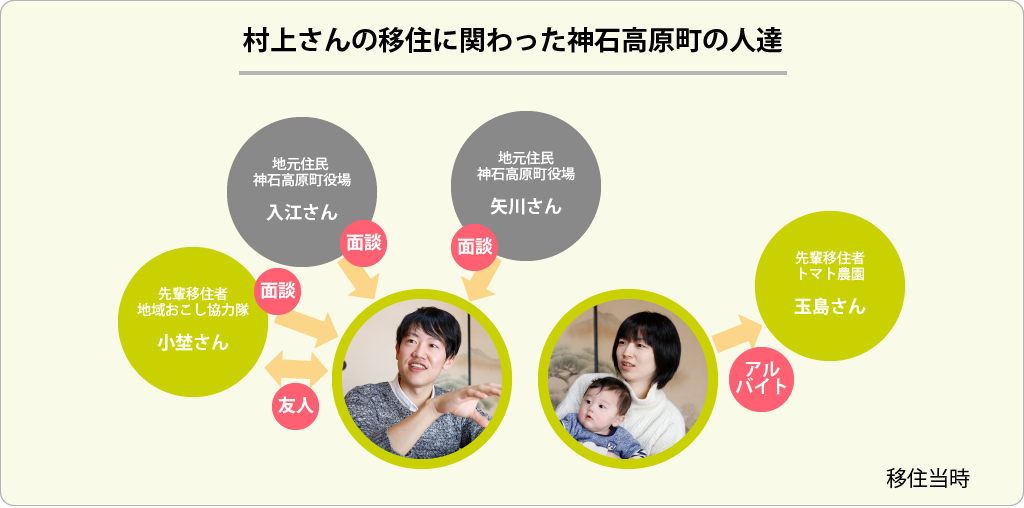 村上さんは神石高原町が募集していた『地域おこし協力隊』の存在を耳にし、「2,3年町から給料をもらいながら神石高原町内で起業ができる『起業特化型』なら、全てが叶うかも!」と決意、すでに1年早く『地域おこし協力隊』で移住していた小埜さん、神石高原町役場の入江さん、矢川さんの御三方のと面談の機会を早速ゲット。