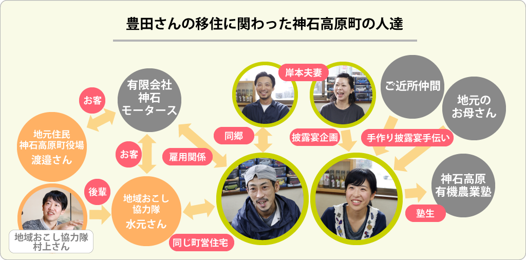 前述の岸本さんが移住してから1年、ちょうど仕事を辞めていた豊田さんの元に岸本さんから「神石高原町の冬はスタッドレスタイヤが絶対に必要なんで、年末の繁忙期1週間バイトに来ないか?」とお誘いが。元々田舎にも興味があった豊田さんは二つ返事で神石高原町へ。これがきっかけで、岸本さんの人間性にも改めて共鳴し、「好きな仕事もあるわけだし、どうせ寒いなら雪が降る方がいい!」と神石高原町への移住を決意。そして気がつけば、10年の月日が流れることに。