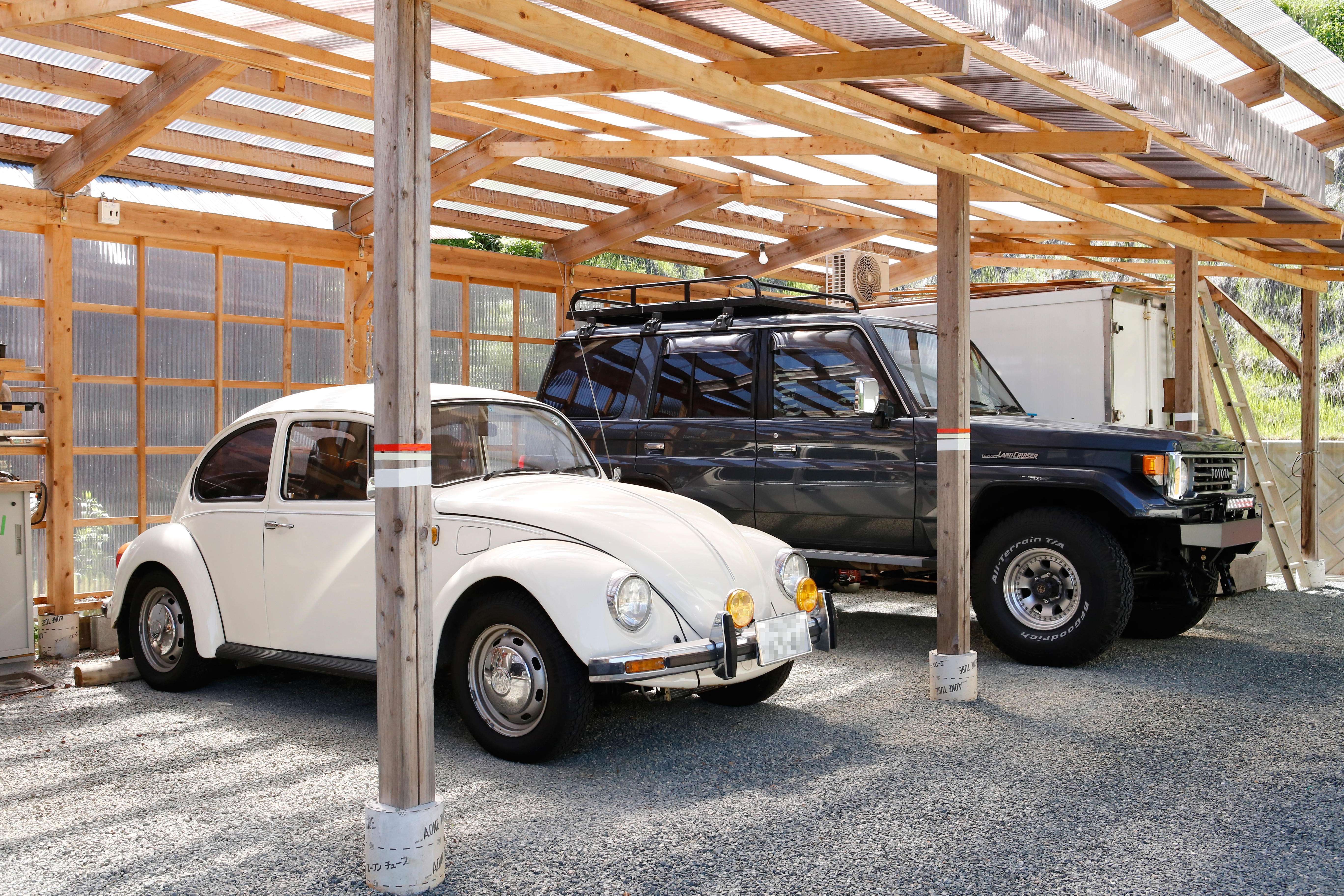 上川家のガレージには、お父さんの趣味のレトロなフォルクスワーゲン・ビートルと、これまたレトロな上川さんの愛車ランドクルーザー70が鎮座していて、なかなかの迫力。
