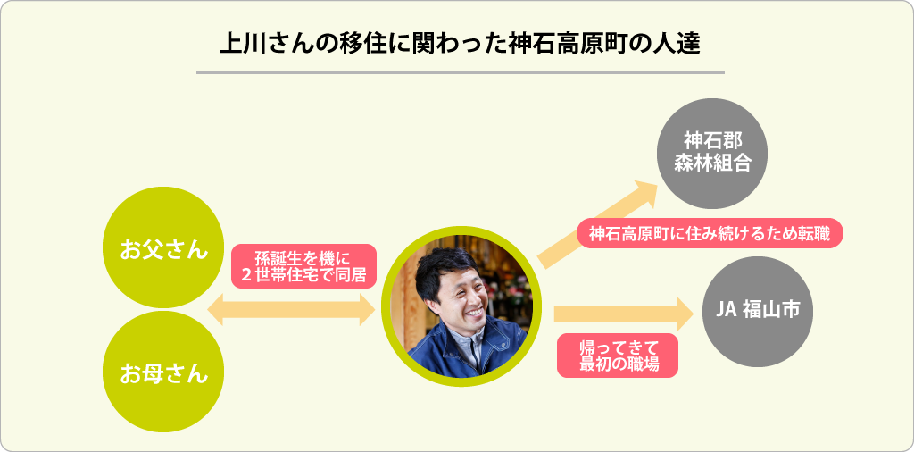 そんな上川さんの神石高原町への完全Uターンを喜んだのはご両親。上川さんの最初のお子さんの出産のタイミングで二世帯住宅を建て同居も決意。そのタイミングでお父さんは長年携わってきた自営の土木関係の仕事からも思い切って引退し、後継ぎの長男を迎え入れることに。ご両親にとっては、孫まで授かっての息子の神石高原町への帰還が本当に嬉しかったのは間違いない。