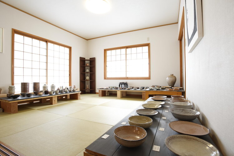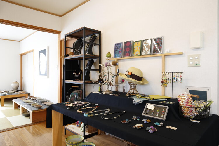 工房兼住宅とは別に離れのギャラリーもあり、玄関から左手の畳の部屋には藤田さんの陶芸作品がずらりと並びます。また、右手のフローリングスペースには奥さんのアクセサリー作品が展示されており居心地の良い空間。作品に囲まれながら、ゆったりとした時間が流れます。